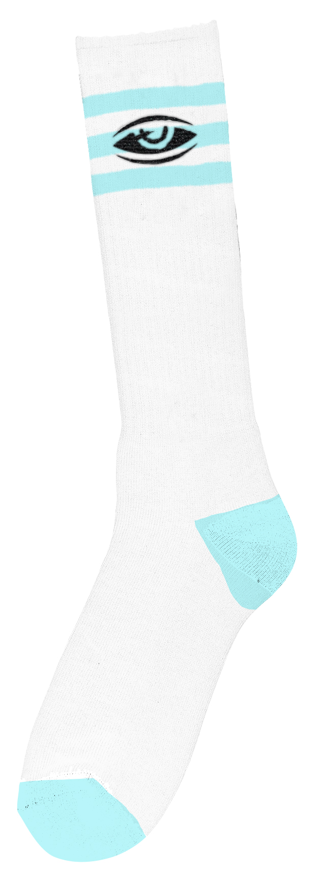 Toy Machine socks white with sky blue accents at toe, heel, and three stripes at top with black embroidered eye.